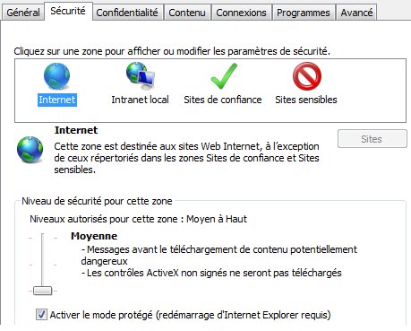 1 - Sous IE, menu "Outils" > "Options Internet" > onglet "Sécurité"  >>  abaisser le niveau de sécurité Internet à "Moyenne" [opération sans danger] :
