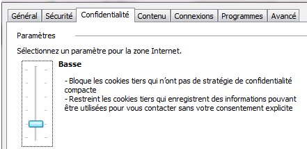 2 - onglet "Confidentialité"  >>  abaisser le paramètre à "Basse", voire si nécessaire à "Accepter tous les cookies" :